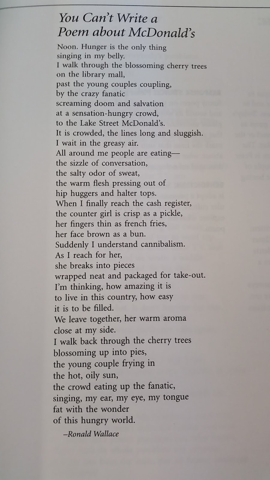 We have started a new poetry unit- we will be reading poetry, writing poems, and writing a literary essay about a self selected poem. This will be a reading and writing unit. We started today with a poem by Ronald Wallace, titled: You can’t write a poem about McDonald’s. It turns out that you can.